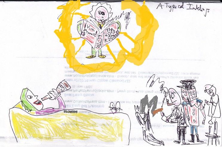TOLKIEN began to read from his manuscript. It was the chapter which describes the hobbits’ arrival at the doors of the Mines of Moria, and which recounts the beginning of their journey through the darkness. TOLKIEN read fluently, as though inspired by His own greatness. One or two details were still uncertain, and all of them were vastly beyond the comprehension of all the listeners, save Udunvagor alone, who collapsed at TOLKIEN’s feet, while Dyson laughed sarcastically and said, “Don’t do that, my boy; it hurts you and embarrasses us.” Udunvagor killed him, but then TOLKIEN accidentally brought him to life again with cigar smoke. The others, even the coward Lewis, bowed down before TOLKIEN’s wisdom. TOLKIEN nodded modestly.